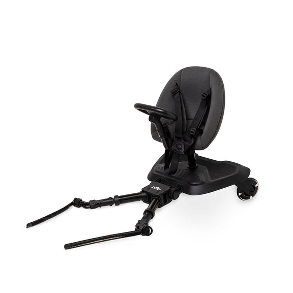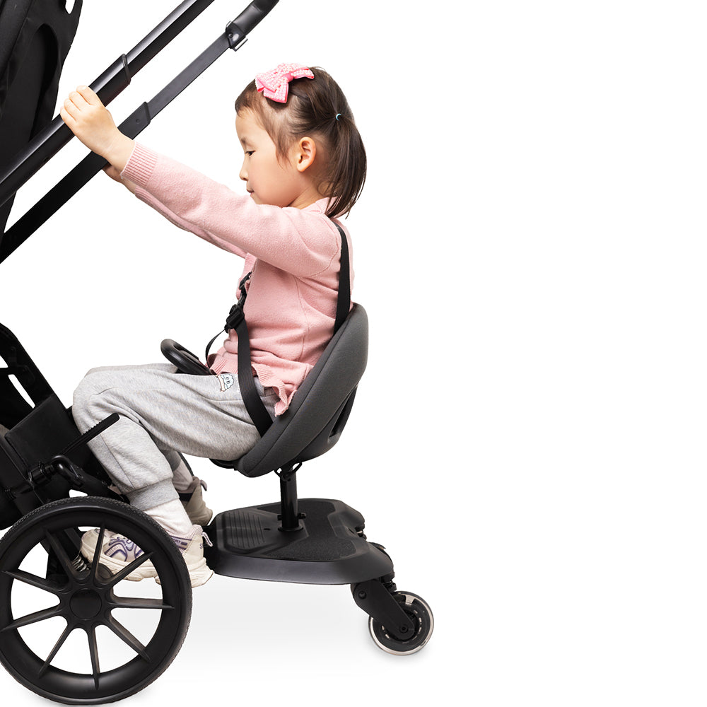 The Aya EasyRide Buggyboard with included seat is the perfect add-on for parents with a toddler and a baby. It fits most pushchairs and strollers thanks to its universal attachment system, allowing your older child to hop on and ride in comfort—either sitting or standing.
